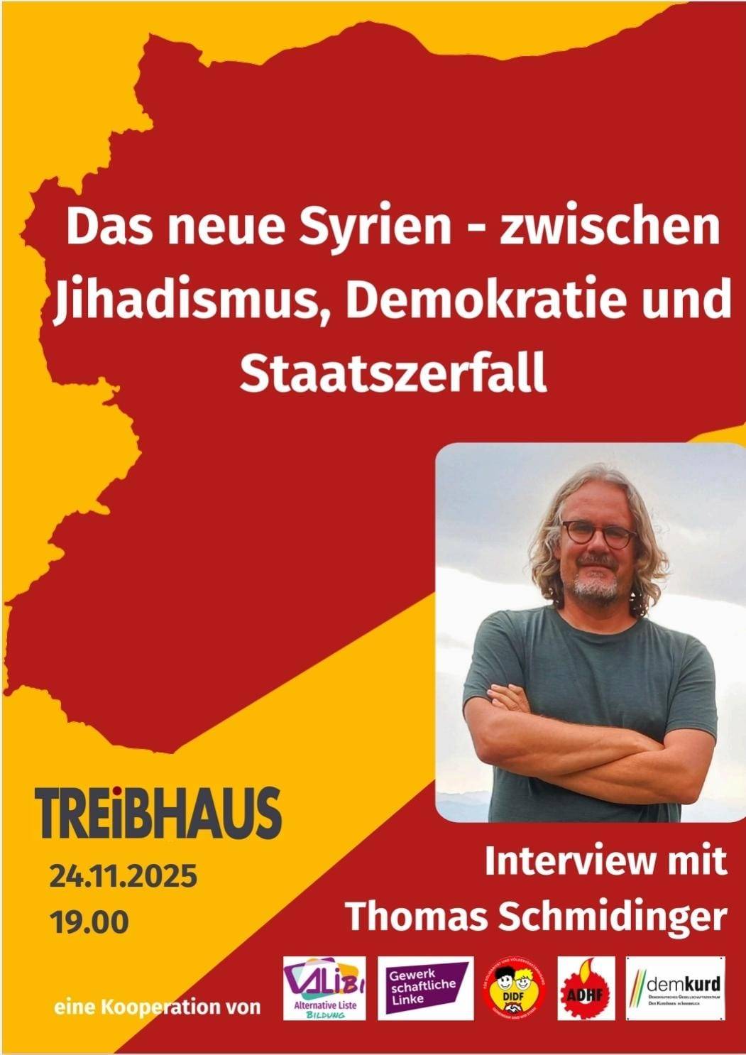 Über 120 Menschen sind am 24. November 2025 der Einladung von AliBi, der Gewerkschaftlichen Linken, von DIDF, ADHF und demkurd ins Treibhaus zu einem Vortrag von Nahostexperten Thomas Schmidinger mit dem Titel „Das neue Syrien – zwischen Jihadismus, Demokratie und Staatszerfall“ gefolgt. Mesut Onay betrat als Erster die Bühne, stellte den Referenten kurz vor und … Weiterlesen Veranstaltung zur aktuellen Lage in Syrien – ein Bericht