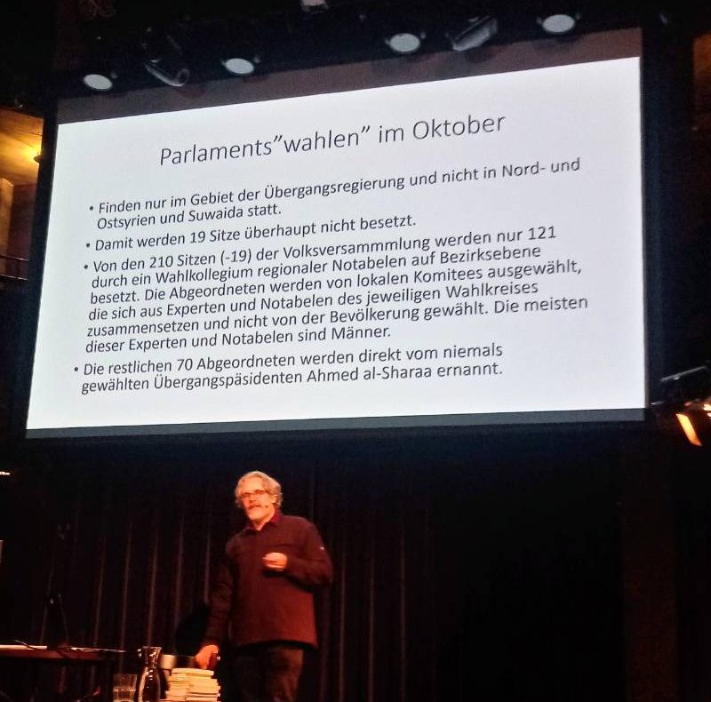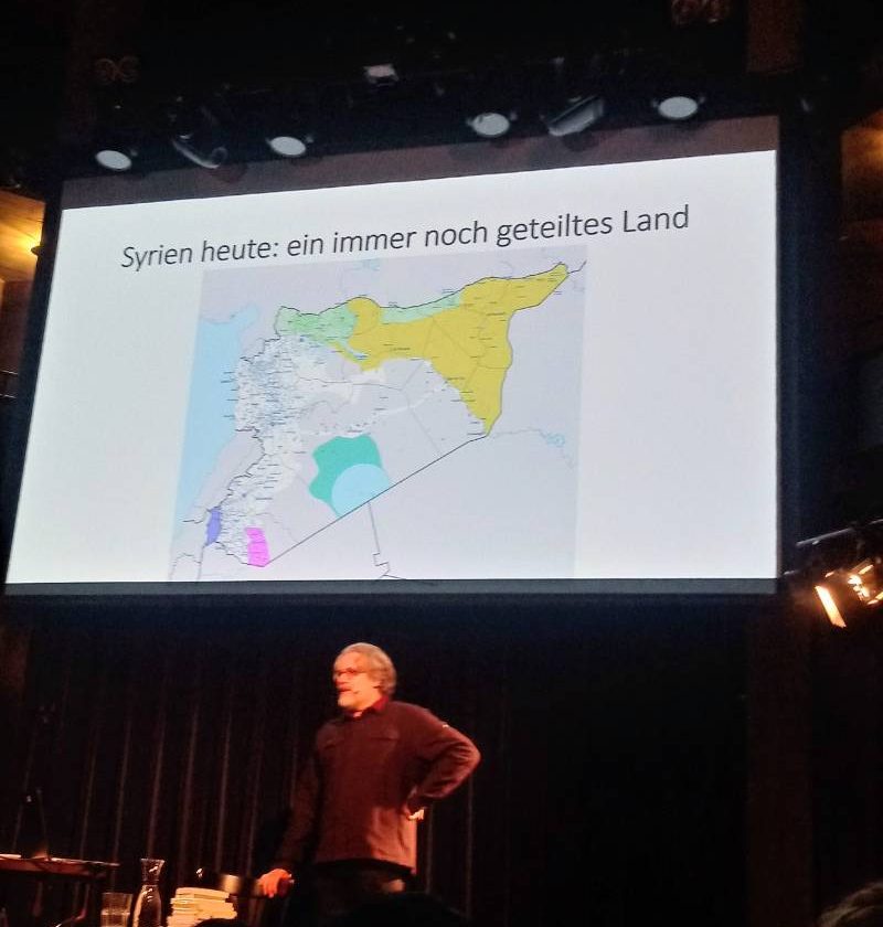 Angekündigt von Mesut Onay trat Thomas Schmidinger vor dem Vorhang und bot Einblicke in die komplexe Situation in Syrien. Unter den großen Akteuren der Region sind die tragenden Kräfte der Autonomen Verwaltung Nord- und Ostsyriens (DAANES/SDF) zweifellos der progressivste, weil er sich nicht ausschließlich als kurdisch, sondern als multiethnisch, multireligiös, säkulär und demokratisch versteht.