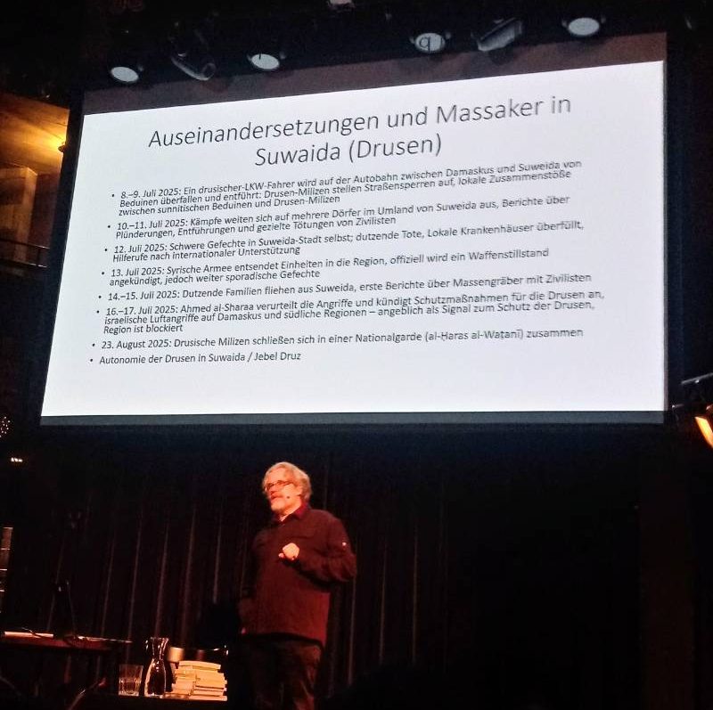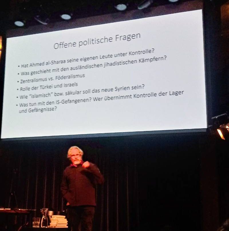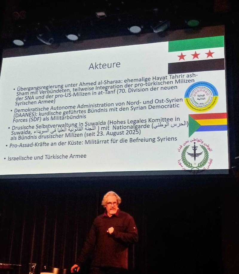 Über 120 Menschen sind am 24. November 2025 der Einladung von AliBi, der Gewerkschaftlichen Linken, von DIDF, ADHF und demkurd ins Treibhaus zu einem Vortrag von Nahostexperten Thomas Schmidinger mit dem Titel „Das neue Syrien – zwischen Jihadismus, Demokratie und Staatszerfall“ gefolgt.