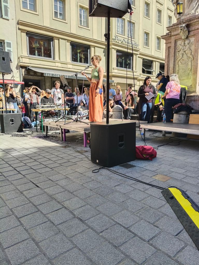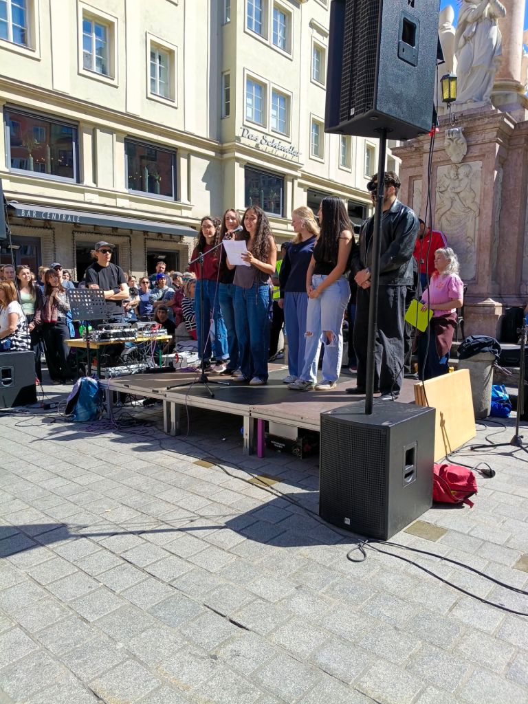 Zahlreiche Redner:innen haben bei der Kundgebung gesprochen. Begonnen wurde die Veranstaltung mit einem musikalischen Beitrag vom Streetnoise Orchestra. Den Einstieg in die Redebeiträge lieferte Sara Schobesberger, die die Petition auf mein #aufstehn startete. Anschließend unter anderem Petra Maria Falkner, Vertreter:innen vom Freundeskreis des AGI und der Schulleitung, Regina Riley, Urban Steiner (SK-Wilten), Petar Rosandić (SOS Balkanroute), Schwester Belinda von den Kreuzschwestern, einem Vertreter der ÖH und die Omas gegen Rechts, die auch eine Theatereinlage machten. Aufgelockert wurden die Redebeiträge durch musikalische Beiträge.